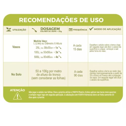 Atenção: Não jogar o adubo nas folhas. Para o plantio das palmeiras utilize o FORTH Plantio. Evitar aplicar nas horas mais quentes e sempre regar logo em seguida aplicação. A adubação com FORTH Palmeiras deve ser feita somente 30 dias após o plantio.