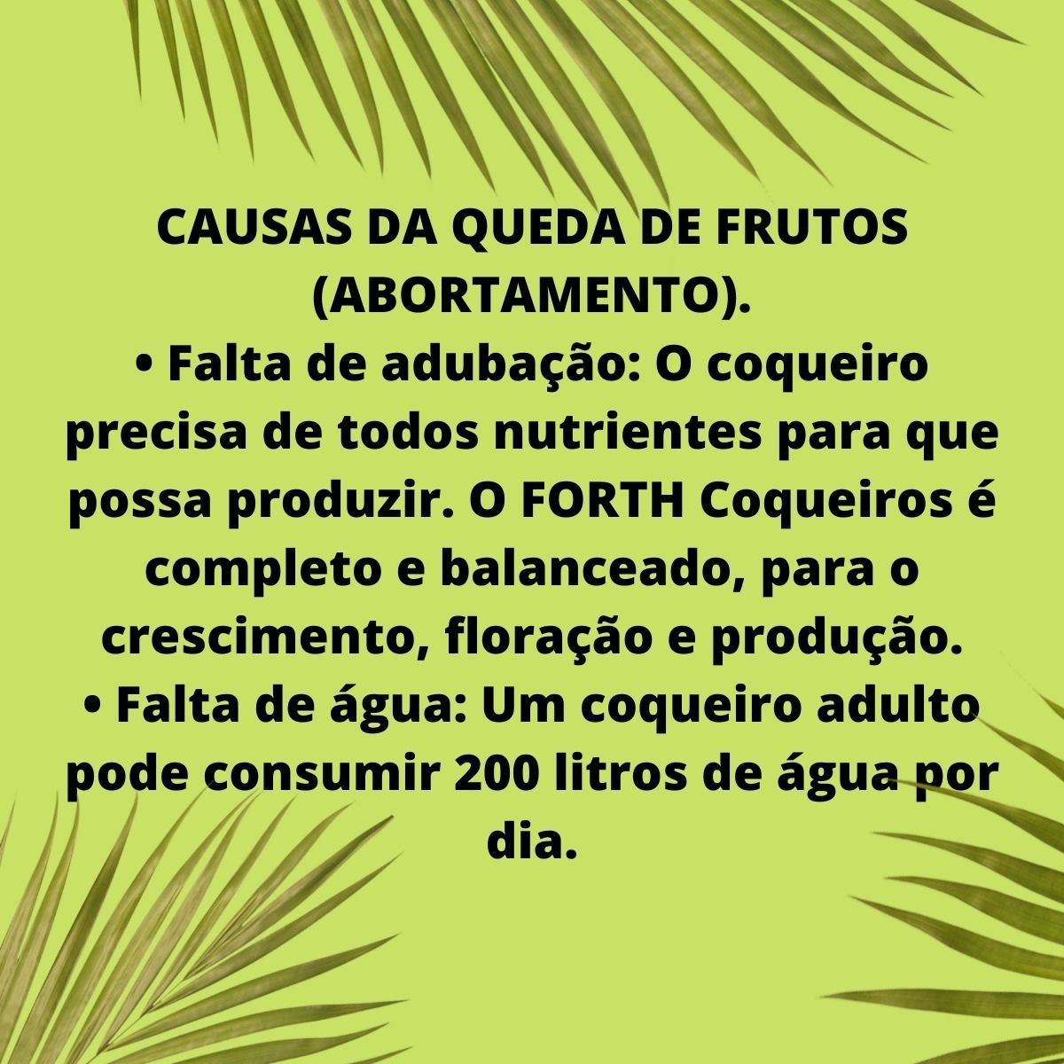 • Falta de adubação: O coqueiro precisa de todos nutrientes para que possa produzir. O FORTH Coqueiros é completo e balanceado, para o crescimento, floração e produção.